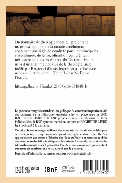 Dictionnaire de théologie morale... présentant un exposé complet de la morale chrétienne, contenant une règle de conduite pour les principales circonstances de la vie, offrant un complément nécessaire à toutes les éditions du Dictionnaire...: suivi d'un Plan méthodique de la théologie laissé inédit par Bergier et d'après lequel on peut lire avec suite son dictionnaire.... Tome 1 / par M. l'abbé Pierrot, ... Date de l'édition originale: 1850-1851 Collection: Encyclopédie théologique ... T. 31-32 Le présent ouvrage s'inscrit dans une politique de conservation patrimoniale des ouvrages de la littérature Française mise en place avec la BNF. HACHETTE LIVRE et la BNF proposent ainsi un catalogue de titres indisponibles, la BNF ayant numérisé ces oeuvres et HACHETTE LIVRE les imprimant à la demande. Certains de ces ouvrages reflètent des courants de pensée caractéristiques de leur époque, mais qui seraient aujourd'hui jugés condamnables. Ils n'en appartiennent pas moins à l'histoire des idées en France et sont susceptibles de présenter un intérêt scientifique ou historique. Le sens de notre démarche éditoriale consiste ainsi à permettre l'accès à ces oeuvres sans pour autant que nous en cautionnions en aucune façon le contenu. Pour plus d'informations, rendez-vous sur www.hachettebnf.fr