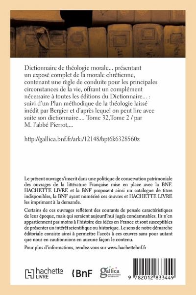 Dictionnaire de théologie morale... présentant un exposé complet de la morale chrétienne, contenant une règle de conduite pour les principales circonstances de la vie, offrant un complément nécessaire à toutes les éditions du Dictionnaire...: suivi d'un Plan méthodique de la théologie laissé inédit par Bergier et d'après lequel on peut lire avec suite son dictionnaire.... Tome 32, Tome 2 / par M. l'abbé Pierrot, ... Date de l'édition originale: 1850-1851 Collection: Encyclopédie théologique ... T. 31-32 Le présent ouvrage s'inscrit dans une politique de conservation patrimoniale des ouvrages de la littérature Française mise en place avec la BNF. HACHETTE LIVRE et la BNF proposent ainsi un catalogue de titres indisponibles, la BNF ayant numérisé ces oeuvres et HACHETTE LIVRE les imprimant à la demande. Certains de ces ouvrages reflètent des courants de pensée caractéristiques de leur époque, mais qui seraient aujourd'hui jugés condamnables. Ils n'en appartiennent pas moins à l'histoire des idées en France et sont susceptibles de présenter un intérêt scientifique ou historique. Le sens de notre démarche éditoriale consiste ainsi à permettre l'accès à ces oeuvres sans pour autant que nous en cautionnions en aucune façon le contenu. Pour plus d'informations, rendez-vous sur www.hachettebnf.fr