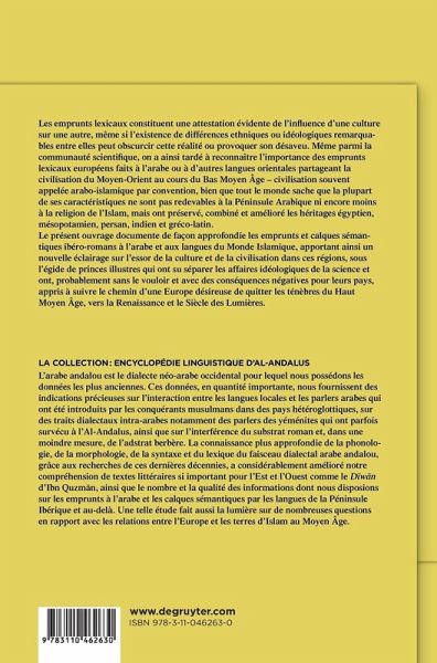 Le présent ouvrage documente de facon approfondie les emprunts et calques sémantiques ibéro-romans à l'arabe et aux langues du Monde Islamique, apportant ainsi un nouvelle éclairage sur l'essor de la culture et de la civilisation dans ces régions, sous l'égide de princes illustres qui ont su séparer les affaires idéologiques de la science et ont, probablement sans le vouloir et avec des conséquences négatives pour leurs pays, appris à suivre le chemin d'une Europe désireuse de quitter les ténèbres du Haut Moyen Âge, vers la Renaissance et le Siècle des Lumières.