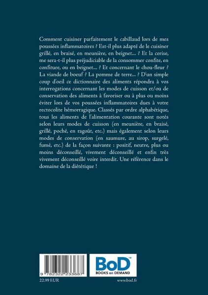 Comment cuisiner parfaitement le cabillaud lors de mes poussées inflammatoires ? Est-il plus adapté de le cuisiner grillé, en braisé, en meunière, en beignet... ? Et la cerise, me sera-t-il plus préjudiciable de la consommer confite, en confiture, ou en beignet... ? Et concernant le chou-fleur ? La viande de boeuf ? La pomme de terre... ? D'un simple coup d'oeil ce dictionnaire des aliments répondra à vos interrogations concernant les modes de cuisson et/ou de conservation des aliments à favoriser ou à plus ou moins éviter lors de vos poussées inflammatoires dues à votre rectocolite hémorragique. Classés par ordre alphabétique, tous les aliments de l'alimentation courante sont notés selon leurs modes de cuisson (en meunière, en braisé, grillé, poché, en ragoût, etc.) mais également selon leurs modes de conservation (en saumure, au sirop, surgelé, fumé, etc.) de la façon suivante : positif, neutre, plus ou moins déconseillé, vivement déconseillé et enfin très vivement déconseillé voire interdit. Une référence dans le domaine de la diététique !