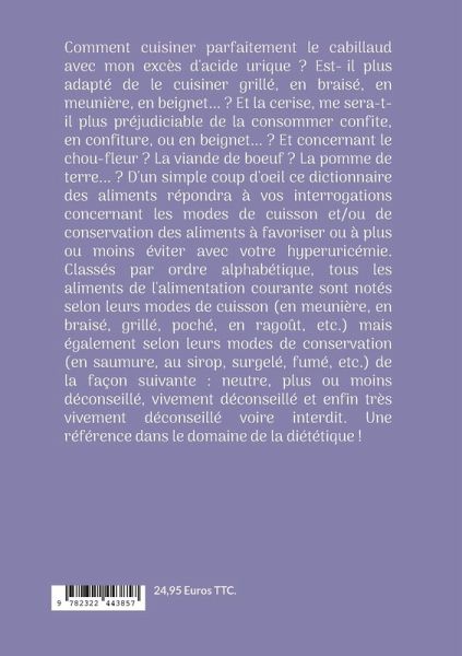 Comment cuisiner parfaitement le cabillaud avec mon excès d'acide urique ? Est-il plus adapté de le cuisiner grillé, en braisé, en meunière, en beignet... ? Et la cerise, me sera-t-il plus préjudiciable de la consommer confite, en confiture, ou en beignet... ? Et concernant le chou-fleur ? La viande de boeuf ? La pomme de terre... ? D'un simple coup d'oeil ce dictionnaire des aliments répondra à vos interrogations concernant les modes de cuisson et/ou de conservation des aliments à favoriser ou à plus ou moins éviter avec votre hyperuricémie. Classés par ordre alphabétique, tous les aliments de l'alimentation courante sont notés selon leurs modes de cuisson (en meunière, en braisé, grillé, poché, en ragoût, etc.) mais également selon leurs modes de conservation (en saumure, au sirop, surgelé, fumé, etc.) de la façon suivante : neutre, plus ou moins déconseillé, vivement déconseillé et enfin très vivement déconseillé voire interdit. Une référence dans le domaine de la diététique !