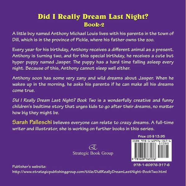 A little boy named Anthony Michael Louis lives with his parents in the town of Dill, which is in the province of Pickle, where his father owns the zoo. Every year for his birthday, Anthony receives a different animal as a present. Anthony is turning two, and for this special birthday, he receives a cute but hyper puppy named Jasper. The puppy has a hard time falling asleep every night. Because of this, Anthony cannot sleep well either. Anthony soon has some very zany and wild dreams about Jasper. When he wakes up in the morning, he asks his parents if he can make all his dreams come true. Did I Really Dream Last Night? Book 2 is a wonderfully creative and funny children's bedtime story that urges kids to go after their dreams, no matter how big they might be. Sarah Palleschi believes everyone can relate to crazy dreams. A full-time writer and illustrator, she is working on further books in this series.