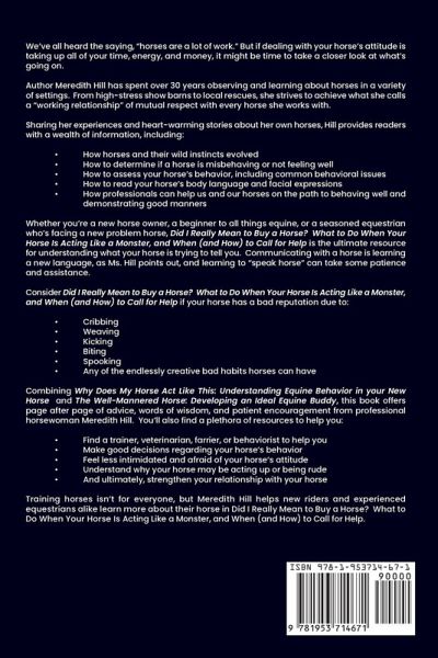 We've all heard the saying, "horses are a lot of work." But if dealing with your horse's attitude is taking up all of your time, energy, and money, it might be time to take a closer look at what's going on. Author Meredith Hill has spent over 30 years observing and learning about horses in a variety of settings. From high-stress show barns to local rescues, she strives to achieve what she calls a "working relationship" of mutual respect with every horse she works with. Sharing her experiences and heart-warming stories about her own horses, Hill provides readers with a wealth of information, including: ¿ How horses and their wild instincts evolved ¿ How to determine if a horse is misbehaving or not feeling well ¿ How to assess your horse's behavior, including common behavioral issues ¿ How to read your horse's body language and facial expressions ¿ How professionals can help us and our horses on the path to behaving well and demonstrating good manners Whether you're a new horse owner, a beginner to all things equine, or a seasoned equestrian who's facing a new problem horse, Did I Really Mean to Buy a Horse? What to Do When Your Horse Is Acting Like a Monster, and When (and How) to Call for Help is the ultimate resource for understanding what your horse is trying to tell you. Communicating with a horse is learning a new language, as Ms. Hill points out, and learning to "speak horse" can take some patience and assistance. Consider Did I Really Mean to Buy a Horse? What to Do When Your Horse Is Acting Like a Monster, and When (and How) to Call for Help if your horse has a bad reputation due to: ¿ Cribbing ¿ Weaving ¿ Kicking ¿ Biting ¿ Spooking ¿ Any of the endlessly creative bad habits horses can have Combining Why Does My Horse Act Like This: Understanding Equine Behavior in your New Horse and The Well-Mannered Horse: Developing an Ideal Equine Buddy, this book offers page after page of advice, words of wisdom, and patient encouragement from professional horsewoman Meredith Hill. You'll also find a plethora of resources to help you: ¿ Find a trainer, veterinarian, farrier, or behaviorist to help you ¿ Make good decisions regarding your horse's behavior ¿ Feel less intimidated and afraid of your horse's attitude ¿ Understand why your horse may be acting up or being rude ¿ And ultimately, strengthen your relationship with your horse Training horses isn't for everyone, but Meredith Hill helps new riders and experienced equestrians alike learn more about their horse in Did I Really Mean to Buy a Horse? What to Do When Your Horse Is Acting Like a Monster, and When (and How) to Call for Help.