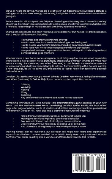 We've all heard the saying, "horses are a lot of work." But if dealing with your horse's attitude is taking up all of your time, energy, and money, it might be time to take a closer look at what's going on. Author Meredith Hill has spent over 30 years observing and learning about horses in a variety of settings. From high-stress show barns to local rescues, she strives to achieve what she calls a "working relationship" of mutual respect with every horse she works with. Sharing her experiences and heart-warming stories about her own horses, Hill provides readers with a wealth of information, including: ¿ How horses and their wild instincts evolved ¿ How to determine if a horse is misbehaving or not feeling well ¿ How to assess your horse's behavior, including common behavioral issues ¿ How to read your horse's body language and facial expressions ¿ How professionals can help us and our horses on the path to behaving well and demonstrating good manners Whether you're a new horse owner, a beginner to all things equine, or a seasoned equestrian who's facing a new problem horse, Did I Really Mean to Buy a Horse? What to Do When Your Horse Is Acting Like a Monster, and When (and How) to Call for Help is the ultimate resource for understanding what your horse is trying to tell you. Communicating with a horse is learning a new language, as Ms. Hill points out, and learning to "speak horse" can take some patience and assistance. Consider Did I Really Mean to Buy a Horse? What to Do When Your Horse Is Acting Like a Monster, and When (and How) to Call for Help if your horse has a bad reputation due to: ¿ Cribbing ¿ Weaving ¿ Kicking ¿ Biting ¿ Spooking ¿ Any of the endlessly creative bad habits horses can have Combining Why Does My Horse Act Like This: Understanding Equine Behavior in your New Horse and The Well-Mannered Horse: Developing an Ideal Equine Buddy, this book offers page after page of advice, words of wisdom, and patient encouragement from professional horsewoman Meredith Hill. You'll also find a plethora of resources to help you: ¿ Find a trainer, veterinarian, farrier, or behaviorist to help you ¿ Make good decisions regarding your horse's behavior ¿ Feel less intimidated and afraid of your horse's attitude ¿ Understand why your horse may be acting up or being rude ¿ And ultimately, strengthen your relationship with your horse Training horses isn't for everyone, but Meredith Hill helps new riders and experienced equestrians alike learn more about their horse in Did I Really Mean to Buy a Horse? What to Do When Your Horse Is Acting Like a Monster, and When (and How) to Call for Help.