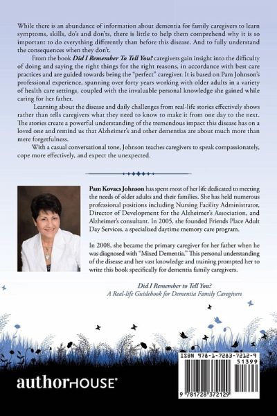 While there is an abundance of information about dementia for family caregivers to learn symptoms, skills, do's and don'ts, there is little to help them comprehend why it is so important to do everything differently than before this disease. And to fully understand the consequences when they don't. From the book Did I Remember To Tell You? caregivers gain insight into the difficulty of doing and saying the right things for the right reasons, in accordance with best care practices and are guided towards being the "perfect" caregiver. It is based on Pam Johnson's professional experience, spanning over forty years working with older adults in a variety of health care settings, coupled with the invaluable personal knowledge she gained while caring for her father. Learning about the disease and daily challenges from real-life stories effectively shows rather than tells caregivers what they need to know to make it from one day to the next. The stories create a powerful understanding of the tremendous impact this disease has on a loved one and remind us that Alzheimer's and other dementias are about much more than mere forgetfulness. With a casual conversational tone, Johnson teaches caregivers to speak compassionately, cope more effectively, and expect the unexpected.
