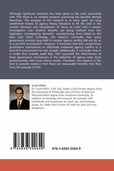 Although significant attention has been given to the costs associated with SOX there is no notable research examining the benefits derived therefrom. The purpose of this research is to draw upon the long established stream of agency theory literature to fill the void in the current literature and complement its focus on costs with a serious investigation into whether benefits are being realized from this legislation. Investigating domestic, manufacturing firms listed on the New York Stock Exchange, this research concludes that many governance controls long held to temper agency conflict did not do so in a pre-SOX environment. However, it illustrates that SOX caused these governance mechanisms to effectively moderate agency conflict in a post-SOX environment for this sample. Additionally, it concludes that in a model that includes audit fees, SOX improved the effectiveness of these governance mechanisms in the reduction of agency costs more predominantly with more robust results. Therefore, this research is the first to provide evidence that there are measurable benefits that flow from the passage of SOX.