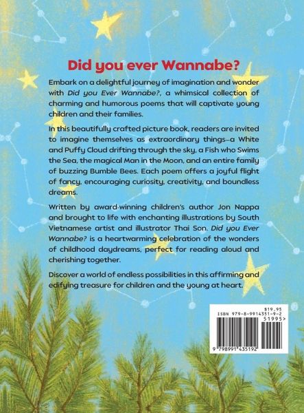 Did You Ever Wannabe? is a whimsical picture book that invites children to imagine life from new perspectives-buzzing as a bee, swimming as a fish, shining as the moon, and floating like a cloud. Through playful, rhythmic poetry and charming illustrations, it celebrates the joy of pretending and dreaming big. At its core, the book is about curiosity, creativity, and the boundless imagination of childhood. Each page encourages kids to ask "What if I could be...?"-reminding them that it's okay to wonder, pretend, and see the world through new, magical lenses. It's not just a collection of poems-it's a gentle invitation to explore identity, empathy, and the natural world through imagination.