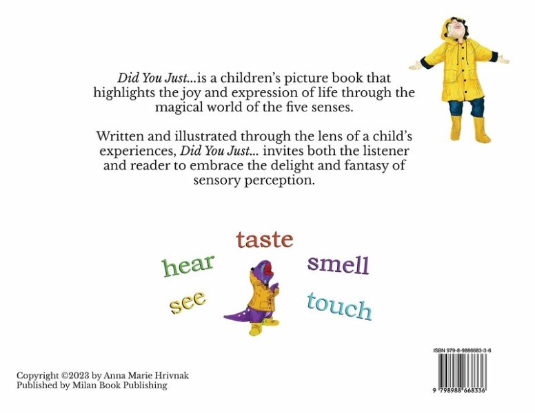Did You Just...is a children's picture book that highlights the joy and expression of life through the magical world of the five senses. Written and illustrated through the lens of a child's experiences, Did You Just... invites both the listener and reader to embrace the delight and fantasy of sensory perception.