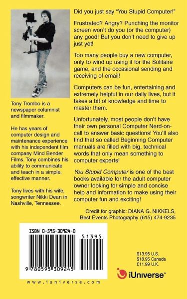 Did you just say "You Stupid Computer!" Frustrated? Angry? Punching the monitor screen won't do you (or the computer) any good! But you don't need to just give up just yet! Too many people buy a new computer, only to wind up using it for the Solitaire game, and the occasional sending and receiving of email! Computers can be fun, entertaining and extremely helpful in our daily lives, but it takes a bit of knowledge and time to master them. Unfortunately, most people don't have their own personal Computer Nerd-on-call to answer basic questions! You'll also find that so called Beginning Computer manuals are filled with big, technical words that only mean something to computer experts! You Stupid Computer is one of the best books available for the adult computer owner looking for simple and concise help and information to make using their computer fun and exciting!