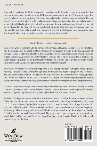 How well do you know the Bible? It was while I was doing my Bible study, it came to my attention that there were many things mentioned in the Bible that others may not be aware of. These were things that even Even I didn't know some things. Therefore, I thought it to be helpful to write such a book "Did you know?" This book is intended to be fun and informative. I hope that it provokes thoughts and discussions about various biblical topics. This book will be something for you to always enjoy. Even if you are not very well versed in the Bible or if you are out of touch with your Bible facts, read this book anyway, you just might be surprised of how much you can learn! If you end up finding out more information than you thought, take it as an opportunity to brush up on your Biblical study!