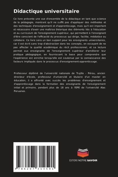Ce livre présente une vue d'ensemble de la didactique en tant que science de la pédagogie, montrant qu'il ne suffit pas d'appliquer des méthodes et des techniques d'enseignement et d'apprentissage, mais qu'il est important et nécessaire d'avoir une maîtrise théorique des éléments liés à l'éducation et au curriculum de l'enseignement supérieur, qui permettent à l'enseignant d'être conscient de l'efficacité du processus qui dirige, facilite, médiatise ou collabore. Ce livre sera un bon support pour les enseignants universitaires, car il est écrit sans trop d'abstraction dans les concepts, en essayant de ne pas affecter la qualité académique du récit professionnel, et sa lecture permet aux enseignants de l'enseignement supérieur d'améliorer leur pratique pédagogique, en fournissant la base pour comprendre que l'expérience est enrichie lorsqu'elle est soutenue par la connaissance des facteurs impliqués dans le processus d'enseignement-apprentissage.