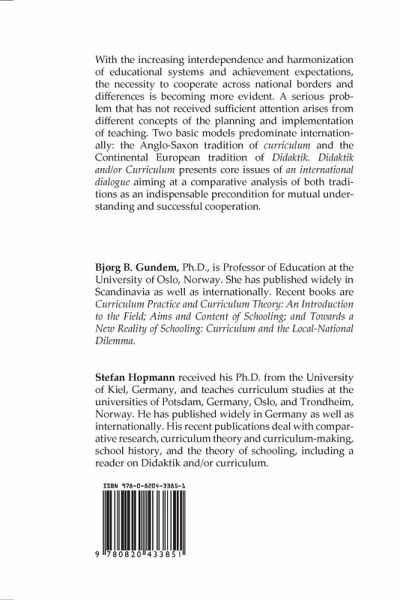 With the increasing interdependence and harmonization of educational systems and achievement expectations, the necessity to cooperate across national borders and differences is becoming more evident. A serious problem that has not received sufficient attention arises from different concepts of the planning and implementation of teaching. Two basic models predominate internationally: the Anglo-Saxon tradition of curriculum and the Continental European tradition of Didaktik. Didaktik and/or Curriculum presents core issues of an international dialogue aiming at a comparative analysis of both traditions as an indispensable precondition for mutual understanding and successful cooperation.