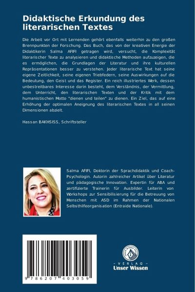 Die Arbeit vor Ort mit Lernenden gehört ebenfalls weiterhin zu den großen Brennpunkten der Forschung. Das Buch, das von der kreativen Energie der Didaktikerin Salma AFIFI getragen wird, versucht, die Komplexität literarischer Texte zu analysieren und didaktische Methoden aufzuzeigen, die es ermöglichen, die Grundlagen der Literatur und ihre kulturellen Repräsentationen besser zu verstehen. Jeder literarische Text hat seine eigene Zeitlichkeit, seine eigenen Triebfedern, seine Auswirkungen auf die Bedeutung, den Geist und das Register. Ein reich illustriertes Werk, dessen unbestreitbares Interesse darin besteht, dem Verständnis, der Vermittlung, dem Unterricht, den literarischen Texten und der Kritik mit dem humanistischen Motto "dienen und teilen" zu dienen. Ein Ziel, das auf eine Erhöhung der optimalen Aneignung des literarischen Textes in all seinen Dimensionen abzielt.Hassan BAKHSISS, Schriftsteller