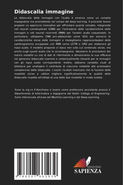 La didascalia delle immagini con l'audio è emersa come un compito impegnativo ma promettente nel campo del deep learning. Il presente lavoro propone un approccio innovativo per affrontare questo compito, integrando reti neurali convoluzionali (CNN) per l'estrazione delle caratteristiche delle immagini e reti neurali ricorrenti (RNN) per l'analisi audio sequenziale. In particolare, utilizziamo CNN pre-addestrate come VGG per estrarre le caratteristiche visive dalle immagini e impieghiamo rappresentazioni dello spettrogramma accoppiate con RNN come LSTM o GRU per elaborare gli input audio. Il modello proposto si basa non solo sul contenuto visivo, ma anche sugli spunti audio che lo accompagnano. Valutiamo le prestazioni del nostro modello su set di dati di riferimento e dimostriamo la sua efficacia nel generare didascalie coerenti e contestualmente rilevanti per le immagini con gli input audio corrispondenti. Inoltre, abbiamo condotto studi di tablatura per analizzare il contributo di ciascuna modalità alle prestazioni complessive delle didascalie. I nostri risultati mostrano che la fusione delle modalità visive e uditive migliora significativamente la qualità delle didascalie rispetto all'utilizzo di una delle due modalità in modo isolato.
