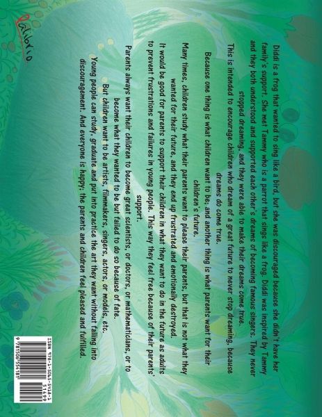 Diddi is a frog that wanted to sing like a bird, but she was discouraged because she didn't have her family's support. She met Tammy who is a parrot that sings like a frog. Diddi was inspired by Tammy and they both understood and supported each other's dreams of becoming famous singers. They never stopped dreaming, and they were able to make their dreams come true. This is intended to encourage children who dream of a great future to never stop dreaming, because dreams do come true. Because one thing is what children want to be; and another thing is what parents want for their children's future. Many times, children study what their parents want to please their parents, but that is not what they wanted for their future, and they end up frustrated and emotionally destroyed. It would be good for parents to support their children in what they want to do in the future as adults to prevent frustrations and failures in young people. This way they feel free because of their parents' support. Parents always want their children to become great scientists, or doctors, or mathematicians, or to become what they wanted to be but failed to do so because of fate. But children want to be artists, filmmakers, singers, actors, or models, etc. Young people can study, graduate and put into practice the art they want without falling into discouragement. And everyone is happy; the parents and children feel pleased and fulfilled.