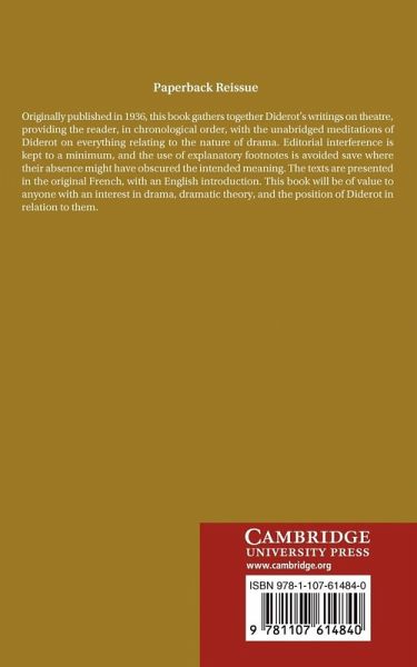 Originally published in 1936, this book gathers together Diderot's writings on theatre, providing the reader, in chronological order, with the unabridged meditations of Diderot on everything relating to the nature of drama. Editorial interference is kept to a minimum, and the use of explanatory footnotes is avoided save where their absence might have obscured the intended meaning. The texts are presented in the original French, with an English introduction. This book will be of value to anyone with an interest in drama, dramatic theory, and the position of Diderot in relation to them.