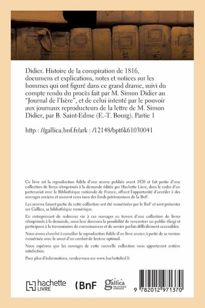 Didier. Histoire de la conspiration de 1816, documens et explications, notes et notices sur les hommes qui ont figuré dans ce grand drame, suivi du compte rendu du procès fait par M. Simon Didier au "Journal de l'Isère", et de celui intenté par le pouvoir aux journaux reproducteurs de la lettre de M. Simon Didier, par B. Saint-Edme (E.-T. Bourg). Partie 1 Date de l'édition originale: 1841 Le présent ouvrage s'inscrit dans une politique de conservation patrimoniale des ouvrages de la littérature Française mise en place avec la BNF. HACHETTE LIVRE et la BNF proposent ainsi un catalogue de titres indisponibles, la BNF ayant numérisé ces oeuvres et HACHETTE LIVRE les imprimant à la demande. Certains de ces ouvrages reflètent des courants de pensée caractéristiques de leur époque, mais qui seraient aujourd'hui jugés condamnables. Ils n'en appartiennent pas moins à l'histoire des idées en France et sont susceptibles de présenter un intérêt scientifique ou historique. Le sens de notre démarche éditoriale consiste ainsi à permettre l'accès à ces oeuvres sans pour autant que nous en cautionnions en aucune façon le contenu. Pour plus d'informations, rendez-vous sur www.hachettebnf.fr