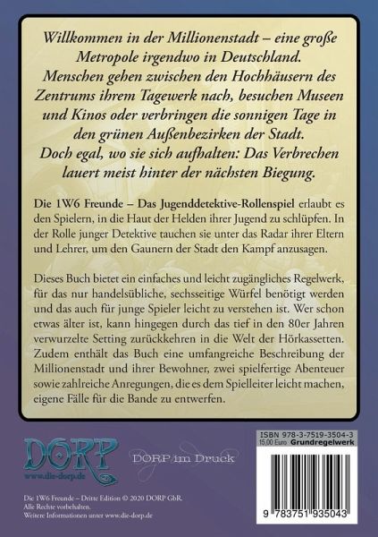 Willkommen in der Millionenstadt - eine große Metropole irgendwo in Deutschland. Menschen gehen zwischen den Hochhäusern des Zentrums ihrem Tagewerk nach, besuchen Museen und Kinos oder verbringen die sonnigen Tage in den grünen Außenbezirken der Stadt. Doch egal, wo sie sich aufhalten: Das Verbrechen lauert meist hinter der nächsten Biegung.Die 1W6 Freunde - Das Jugenddetektive-Rollenspiel erlaubt es den Spielern, in die Haut der Helden ihrer Jugend zu schlüpfen. In der Rolle junger Detektive tauchen sie unter das Radar ihrer Eltern und Lehrer, um den Gaunern der Stadt den Kampf anzusagen. Dieses Buch bietet ein einfaches und leicht zugängliches Regelwerk, für das nur handelsübliche, sechsseitige Würfel benötigt werden und das auch für junge Spieler leicht zu verstehen ist. Wer schon etwas älter ist, kann hingegen durch das tief in den 80er Jahren verwurzelte Setting zurückkehren in die Welt der Hörkassetten. Zudem enthält das Buch eine umfangreiche Beschreibung der Millionenstadt und ihrer Bewohner, zwei spielfertige Abenteuer sowie zahlreiche Anregungen, die es dem Spielleiter leicht machen, eigene Fälle für die Bande zu entwerfen.