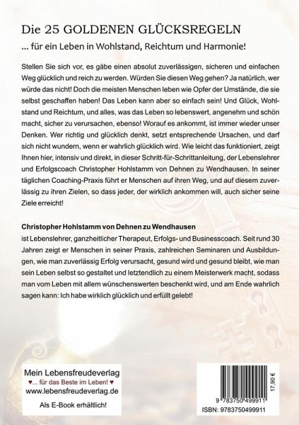 Stellen Sie sich vor, es gäbe einen absolut zuverlässigen, sicheren und einfachen Weg glücklich und reich zu werden. Würden Sie diesen Weg gehen? Ja natürlich, wer würde das nicht! Doch die meisten Menschen leben wie Opfer der Umstände, die sie selbst geschaffen haben! Das Leben kann aber so einfach sein! Und Glück, Wohlstand und Reichtum, und alles, was das Leben so lebenswert, angenehm und schön macht, sicher zu verursachen, ebenso! Worauf es ankommt, ist immer wieder unser Denken. Wer richtig und glücklich denkt, setzt entsprechende Ursachen, und darf sich nicht wundern, wenn er wahrlich glücklich wird. Wie leicht das funktioniert, zeigt Ihnen hier, intensiv und direkt, in dieser Schritt-für-Schrittanleitung, der Lebenslehrer und Erfolgscoach Christopher Hohlstamm von Dehnen zu Wendhausen. In seiner täglichen Coaching-Praxis führt er Menschen auf ihren Weg, und auf diesem zuverlässig zu ihren Zielen, sodass jeder, der wirklich ankommen will, auch sicher seine Ziele erreicht!