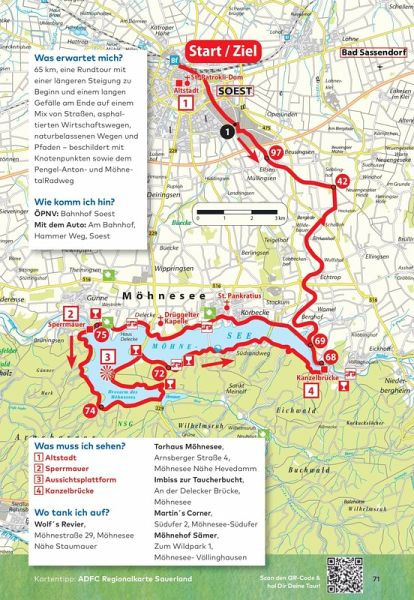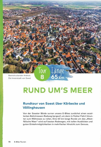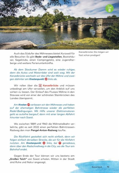 Die 27 schönsten E-Bike Touren im SauerlandDieser Radwanderführer speziell für E-Biker führt Sie auf 27 ausgewählten Radtourendurch alle Regionen des Sauerlandes. Dabei werden selbstverständlich "Klassiker" unterdie Pneus genommen wie beim Ruhrtal-Radweg, bei der Lenneroute oder rund um diebekannten Stauseen. Aber es werden auch weniger bekannte Regionen erschlossenwie Hönne-, Möhne- oder Baarbachtal.Herausragende Monumente der Industriekultur liegen ebenso am Wegesrand, wieKirchen, Schlösser und reizvolle Ortskerne. Für eine umweltbewusste An- und Abreisesorgen die Start- und Zielorte, die allesamt an Bahnhöfen liegen. Auf Ladestationenfür die E-Bike-Akkus wird ebenso hingewiesen, wie auf Wohnmobil-Stellplätze und herausragendeSehenswürdigkeiten. Den Biker erwartet ein Füllhorn an Sehenswertem,eingebettet in viel Natur, aber auch in quirlige Städte auf bestens ausgeschildertenRadwegen quer durch das Sauerland.Mit GPS-Track-Download der TourenDie Touren:1 Rundtour von Hagen über Hohenlimburg, 31 km2 Rundtour von Iserlohn über Sümmern, 41 km3 Rundtour von Iserlohn über Hemer, 43 km4 Streckentour von Neuenrade nach Menden, 29 km5 Rundtour von Werdohl nach Letmathe, 31 km6 Rundtour von Balve über Amecke, 32 km7 Streckentour von Arnsberg nach Fröndenberg, 37 km8 Rundtour von Soest um die Möhnetalsperre, 64 km9 Rundtour von Warstein über Hirschberg, 35 km10 Rundtour von Freienohl über Eslohe, 46 km11 Rundtour von Meschede über Enkhausen, 24 km12 Rundtour von Brilon über Niederalme, 40 km13 Rundtour von Willingen über Bontkirchen, 39 km14 Rundtour von Winterberg über Niedersfeld, 40 km15 Rundtour von Winterberg über Hallenberg, 40 km16 Streckentour von Winterberg nach Lennestadt, 56 km17 Rundtour von Bad Berleburg über Erndtebrück, 38 km18 Rundtour von Kirchhundem über Oberhundem, 35 km19 Rundtour Sauerlandring von Lennestadt über Schmallenberg, 83 km20 Rundtour von Finnentrop über Elspe, 36 km21 Streckentour von Lennestadt über Plettenberg nach Werdohl, 45 km22 Rundtour von Attendorn über Finnentrop, 43 km23 Rundtour von Attendorn über Olpe, 36 km24 Rundtour von Olpe über Wenden, 27 km25 Streckentour von Olpe nach Gummersbach, 30 km26 Rundtour von Meinerzhagen über Velbert, 48 km27 Rundtour von Marienheide über Kierspe, 32 kmMit Ortsporträts von:Meschede/Iserlohn/Winterberg/Arnsberg/Schmallenberg