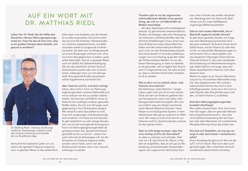Einzelsubstanzen. Um so mehr hat mich das Buch angesprochen und ich habe mich sehr gefreut, dass wieder ein Buch…mehrWas Dr. Matthias Riedl der 28-Tage Nährstoffkur schreibt sind keine neuen Erkenntnisse. Schon Hippokrates sagte "Lass Nahrung deine Medizin sein" und Naturheilpraktiker lernen schon sein Jahrzehnten, dass sowohl die Pflanzen als auch die Nahrung als Vielstoffgemisch wirken und nicht als Einzelsubstanzen. Um so mehr hat mich das Buch angesprochen und ich habe mich sehr gefreut, dass wieder ein Buch auf den Markt kommt, dass genau das Prinzip deutlich unterstreicht. Wer sich gesund und ausgewogen ernährt, braucht keine Nahrungsergänzungsmittel.