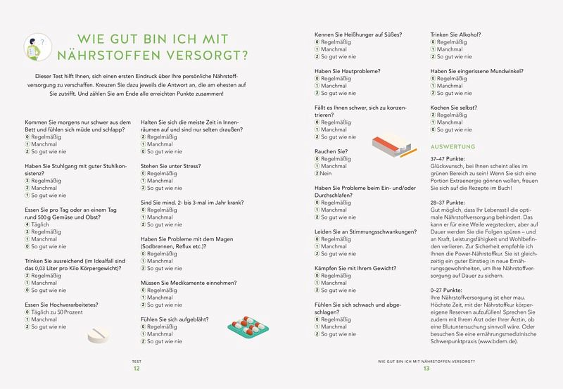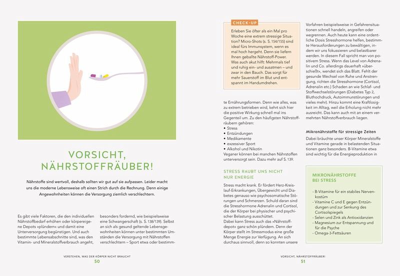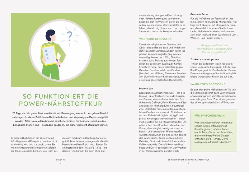 Das Buch ist ansprechend und übersichtlich aufgebaut. Was mir besonders gefällt ist, dass das Buch nicht wie die meisten anderen aufgebaut ist. Zu Beginn kommt eine kurze Einführung bevor schon die ersten Rezepte folgen. Für die erste Woche wird jeweils ein Rezept für Frühstück, Mittag- und Abendessen vorgestellt. Danach geht es weiter mit der Erklärung der Nährstoffe, wie sie wirken und wo sie zu finden sind. Dabei wird jeweils abgewechselt zwischen Input und Rezept. Das sorgt dafür, dass man wirklich das ganze Buch durchblättert und immer wieder an interessanten Stelen hängen bleibt und nicht einfach direkt eine Hälfte des Buchs überspringt.