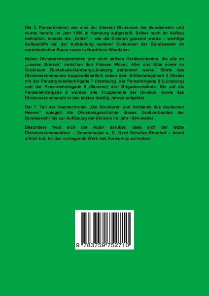 In diesem Band wird die Chronik der 3. Panzerdivision der Bundeswehr vorgestellt, die im "Nassen Dreieck" - dem Raum zwischen zwischen Buxtehude, Hamburg und Lüneburg -stationiert war. Im Jahr 1956 in Hamburg aufgestellt und später nach Buxtehude verlegt, wo die Division bis zur Auflösung im Jahr 1994 stationiert war. Mit dem Artillerieregiment 3 sowie der Panzergrenadierbrigade 7 (Hamburg), der Panzerbrigade 8 (Lüneburg) und der Panzerlehrbrigade 9 im niedersächsischen Munster führte das Divisionskommando neben diversen aktiven und nichtaktiven Divisionstruppenteilen die genannten Brigade- und Regiementsverbände.