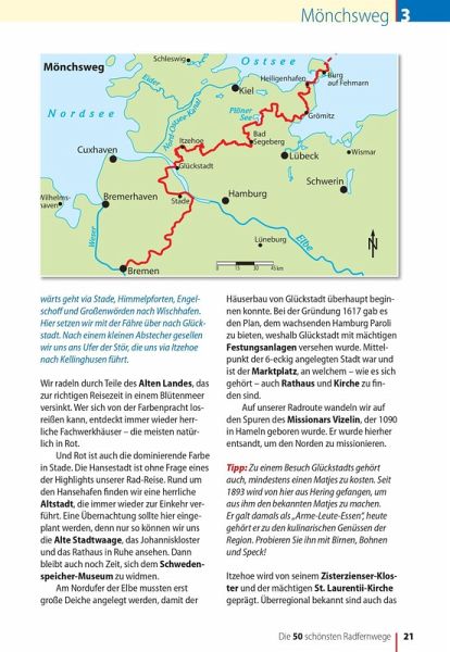 50 tolle Radreisen im Radfahrparadies Deutschland auf den schönsten Fahrradrouten zwischen Küste und AlpenMachen Sie doch mal Urlaub mit dem Fahrrad - Deutschlands Radfernwege bieten dafür die ideale Routenauswahl. Denn hier stimmt einfach alles: die Beschilderung, die landschaftliche Vielfalt, die Infrastruktur, der Erlebniswert.Dieses Buch präsentiert Ihnen die 50 schönsten Radfernwege in Deutschland. Von Nord- und Ostsee über Weser, Elbe, Altmühl zur Donoau und zum Inn - vom Klassiker bis zu "Geheimtipp"... Hier finden Sie Ihre ganz persönliche Traumtour.Reich bebildert, mit informativen Texten und Tourenbeschreibungen vermittelt Ihnen dieser Ratgeber die spezielle Charakteristik der jeweiligen Tour.Eine Übersichtskarte mit dem Streckenverlauf, Tipps zu Sehens- und Erlebenswertem, zu Historie, Kultur und Küche runden das Infopaket ab.Die schönsten Radfernwege in Deutschland: das ist Genussradeln für die ganze FamilieTour 1: Grenzroute und Nordsee-Ostsee-Radweg von Flensburg nach Höjer / 130 kmTour 2: Nord-Ostsee-Kanal-Tour von Brunsbüttel nach Kiel / 325 kmTour 3: Mönchsweg von Glückstadt nach Puttgarden, Fehmann / 342 kmTour 4: Ochsenweg von Wedel nach Flensburg / 246 kmTour 5: Emsland-Route von Rheine nach Papenburg / 285 kmTour 6: Nordseeküstenradweg von Leer nach Ruttebüll / 907 kmTour 7: Alte Salzstraße / 116 kmTour 8: Brückenweg von Osnabrück nach Bremen / ca. 150 kmTour 9: Aller-Radweg von Seehausen nach Verden / 260 kmTour 10-1: Elbe-Radweg Teil 1 von Bad Schandau nach Magdeburg / 348 kmTour 10-2: Elbe-Radweg Teil 2 von Magdeburg nach Cuxhaven / 512 kmTour 11: Weser-Radweg von Hannoversch Münden nach Bremerhaven / 425 kmTour 12: Mecklenburgischer Seen-Radweg von Lüneburg nach Usedom / 664 kmTour 13: Ostseeküsten-Radweg von Flensburg nach Ahlbeck / 1.083 kmTour 14: Frosch-Radweg Rundtour von Hoyerswerda durch die Lausitz / 266 kmTour 15: Gurken-Radweg Zwei Touren rund um Lübben / 250 kmTour 16: Oder-Neiße-Radweg von Zittau bis Ueckermünde / 465 kmTour 17: Havelland-Radweg von Schönewald nach Grütz / 100 kmTour 18: Radweg Berlin-Kopenhagen von Berlin nach Kopenhagen / 630 kmTour 19: Berliner Mauerweg entlang der ehemaligen innerdeutschen Grenze durch Berlin / 160 kmTour 20: Berlin-Usedom von Berlin bis Peenemünde / 337 kmTour 21: Saale-Radwanderweg von Zell bis Barby/Elbe / 407 kmTour 22: 100-Schlösser-Route Rundtouren durch das Münsterland / 960 kmTour 23: RuhrtalRadweg von Winterberg nach Duisburg / 240 kmTour 24: Bergische Panoramaradwege / 133 kmTour 25-1: Rhein-Radweg Süd von Konstanz nach Mainz / insgesamt 1.320 kmTour25-2: Rhein-Radweg Nord von Mainz nach Emmerich / insgesamt 1.320 kmTour 26: Siegtal-Radweg von der Siegquelle nach Siegburg / 140 kmTour 27: Eder-Radweg von Lützel nach Guxhagen / 183 kmTour 28: Fulda-Radweg von der Wasserkuppe nach Hannoversch Münden / 194 kmTour 29: Main-Radweg von Frankfurt nach Bayreuth / 540 kmTour 30: Thüringer Städtekette von Eisenach bis Altenberg / 225 kmTour 31: Werratal-Radweg von Siegmundsburg bis Hannoversch Münden / 300 kmTour 32: Rhön-Radweg / 181 kmTour 33: Lahntal-Radweg von Bad Lassphe nach Lahnstein / 245 kmTour 34: Ahr-Radweg von Blankenheim-Wald nach Remagen / 85 kmTour 35: Mosel-Radweg von Trier nach Koblenz / 208 kmTour 36: Nahe-Radweg von Selbach nach Bingen / 122 kmTour 37: Deutsche Weinstraße von Bockenheim nach Wissembourg / 97 kmTour 38: Saarland-Radweg rund um Saarbrücken / 362 kmTour 39: Liebliches Taubertal von Wertheim bis Rothenburg o.d.T. / ca. 100 kmTour 40: RFW Sächsische Mittelgebirge / 421 kmTour 41: Neckartal-Radweg von Villingen-Schwenningen nach Mannheim / 358 kmTour 42: Donau-Bodensee-Radweg von Ulm nach Kressbronn / 161 kmTour 43: Bodensee-Königsee-Radweg von Lindau bis zum Königssee / 418 kmTour 44: Bodensee-Radweg von Konstanz rund um den Bodensee / 260 kmTour 45: Fünf-Flüsse-Radweg von Nürnberg nach Regensburg und retour / 311 kmTour 46: Radrunde Allgäu / 450 kmTour 47: Altmühlr