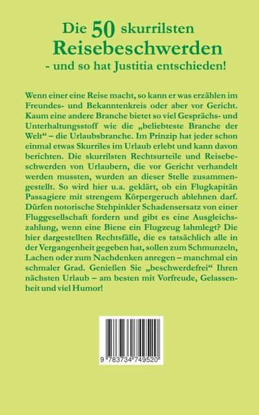 Wenn einer eine Reise macht, so kann er was erzählen im Freundes- und Bekanntenkreis oder aber vor Gericht. Kaum eine andere Branche bietet so viel Gesprächs- und Unterhaltungsstoff wie die "beliebteste Branche der Welt" - die Urlaubsbranche. Im Prinzip hat jeder schon einmal etwas Skurriles im Urlaub erlebt und kann davon berichten. Die skurrilsten Rechtsurteile und Reisebeschwerden von Urlaubern, die vor Gericht verhandelt werden mussten, wurden an dieser Stelle zusammengestellt. So wird hier u.a. geklärt, ob ein Flugkapitän Passagiere mit strengem Körpergeruch ablehnen darf. Dürfen notorische Stehpinkler Schadensersatz von einer Fluggesellschaft fordern und gibt es eine Ausgleichzahlung, wenn eine Biene ein Flugzeug lahmlegt? Die hier dargestellten Rechtsfälle, die es tatsächlich alle in der Vergangenheit gegeben hat, sollen zum Schmunzeln, Lachen oder zum Nachdenken anregen - manchmal ein schmaler Grad. Genießen Sie "beschwerdefrei" Ihren nächsten Urlaub - am besten mit Vorfreude, Gelassenheit und viel Humor!