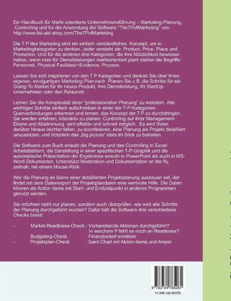 Die 7 P des Marketing Ein Handbuch für Marktorientierte Unternehmensführung - Marketing-Planung, -Controlling und für die Anwendung der Software "The7PofMarketing" von http://www.list-aid-shop.com/The7PofMarketingDie 7 P des Marketing sind ein einfach verständliches Konzept um in Marketingkategorien zu denken. Jeder versteht sie: Product, Price, Place und Promotion. Und für die anderen drei Kategorien, die ihre Nützlichkeit bewiesen haben, wenn man für Dienstleistungen marktorientiert plant: Personnel, Physical Facilities/~Evidence, Process.Lassen Sie sich inspirieren von den 7 P Kategorien und denken Sie über Ihren eigenen, einzigartigen Marketing-Plan nach. Planen Sie z.B. die Schritte für ein Going-To-Market für Ihr neues Produkt, Ihre Dienstleistung, Ihr StartUp-Unternehmen oder den Relaunch Ihrer Marke. Während Sie die Software benutzen werden Sie die Komplexität einer "professionellen Planung" erfahren und meistern. Sie werden sehen, alle operativen Schritte können Sie einfach aufschreiben in den Bereichen einer der 7-P-Segmente. Sie werden Querverbindungen erkennen und lernen das Konzept der 7 P zu durchdringen. Sie werden erfahren, dass Sie eine interaktive Möglichkeit haben zu planen. Controlling auf ihrer Management-Ebene wird effektiv und schnell möglich. Es wird ihnen darüber hinaus leichter fallen, zu koordinieren, eine Planung als Projekt detailliert umzusetzen und trotzdem das "big picture" stets im Blick zu behalten.Die Software zum Buch erlaubt die Planung und das Controlling in Excel-Arbeitsblättern, die Darstellung in einer spezifischen 7-P-Graphik und die automatische Präsentation der Ergebnisse sowohl in PowerPoint als auch in MS-Word-Dokumenten. Moderation und Dokumentation on the fly, schnell mit einem Klick.Wer die Planung im Sinne einer detaillierten Projektplanung ausbauen will, der findet mit dem Datenexport der Projektplandaten eine wertvolle Hilfe. Die Daten können als Action Items mit Start- und Endzeitpunkt in anderen Programmen genutzt werden.Sie möchten nicht nur planen, sondern auch überprüfen, wie weit alle Schritte der Planung durchgeführt wurden. Dafür hält die Software drei verschiedene Checks bereit:- Check zur Market-Readiness: Wurden alle vorbereitenden Aktionen durchgeführt? In welchem der 7 P besteht noch Handlungsbedarf? - Budgeting-Check: Finanzbedarf ermitteln- Projektplan-Check: Gant-Chart mit Action Items, Timeline und Ampel
