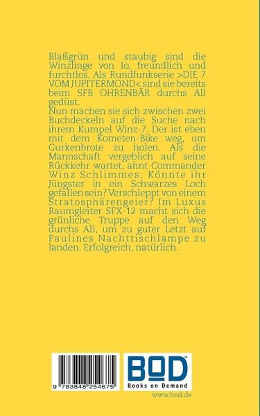Blaßgrün und staubig sind die Winzlinge von Io, freundlich und furchtlos. Als Rundfunkserie >DIE 7 VOM JUPITERMOND< sind sie bereits beim SFB OHRENBÄR durchs All gedüst.Nun machen sie sich zwischen zwei Buchdeckeln auf die Suche nach ihrem Kumpel Winz-7. Der hat sich auf sein Kometen-Bike geschwungen, um eben schnell Gurkenbrote von der Imbissbude am Ende des Universums zu holen. Als die hungrige Mannschaft vergeblich auf seine Rückkehr wartet, ahnt Commander Winz Schlimmes: Könnte ihr Jüngster in ein Schwarzes Loch gefallen sein? Verschleppt von einem Stratosphärengeier? Bestohlen von einem Mondwurm? Alles ist möglich in der unendlichen Weite des Alls ... Im Luxus-Raumgleiter SFX-12 macht sich die grünliche Truppe auf den Weg, um zu guter Letzt auf Paulines Nachttischlampe zu landen. Erfolgreich, natürlich.