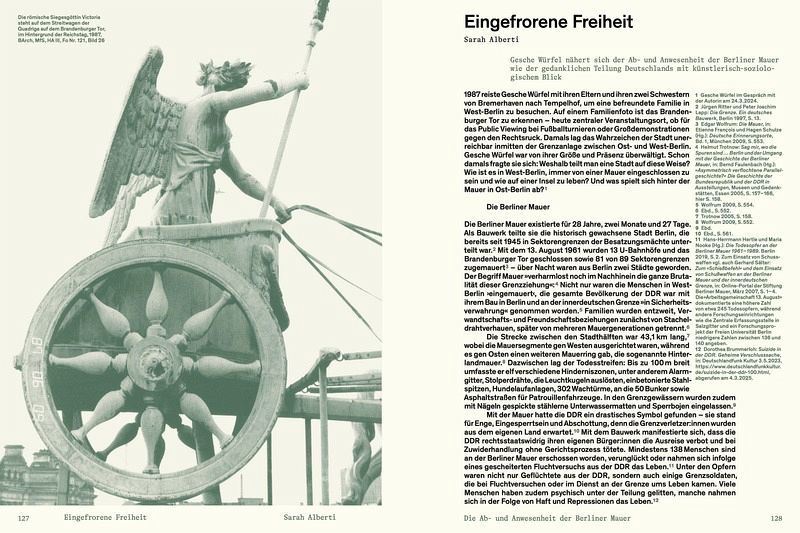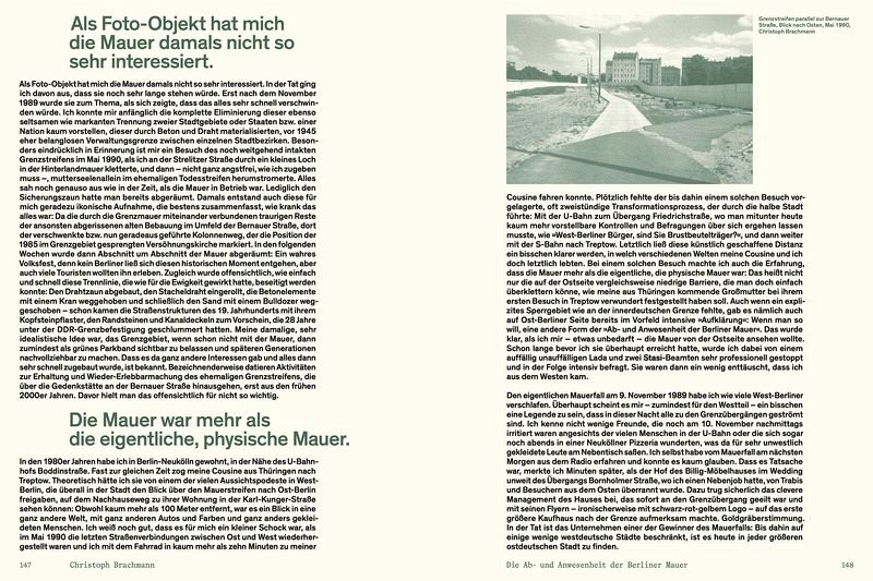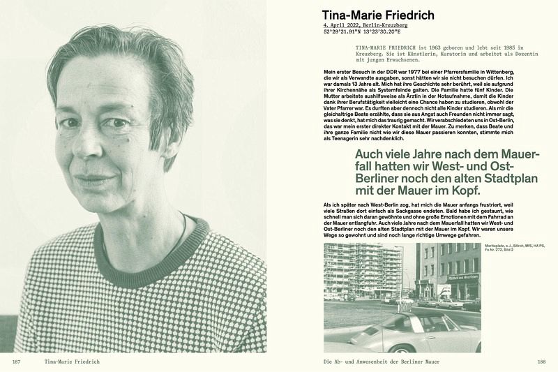 Die Ab- und Anwesenheit der Berliner Mauer ist eine Erkundung der Topografie entlang der Teilung des Landes und bietet eine neue Art des Nachdenkens über das Erbe der Mauer: Würfel fuhr den Berliner Mauerweg ab und stoppte alle 2,8 Kilometer - für 28 Jahre Mauergeschichte -, um den Istzustand der Trennungslinie in Berlin und Brandenburg zu dokumentieren. Neben den eigens für das Buchprojekt entstandenen Fotografien der Orte, an denen die geteilte Stadt Realität war, sammelte die Künstlerin, Stadtplanerin und Soziologin Materialien des Stasi-Unterlagen-Archiv und sprach mit Zeitzeug_innen wie politischen Häftlingen, ehemaligen Gastarbeiter_innen und Personen aus Politik und Kultur über ihre Erinnerungen. Würfel entwirft ein vielschichtiges Panorama und Porträt eines Deutschlands, dessen Teilung und Wiedervereinigung das Land bis heute prägen.