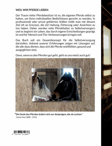 Der Traum vieler Pferdebesitzer ist es, die eigenen Pferde selbst zu halten, um ihren individuellen Bedürfnissen gerecht zu werden.In professionell oder privat geführten Ställen stößt man mit diesem Ziel oft an Grenzen, die mit Haltung, Fütterung oder Ansichten zu tun haben. Daher werden viele Pferdehalter zu Selbstversorgern und es beginnt ein Leben, das durch eigene Entscheidungen geprägt ist und für Mensch und Tier Verbesserungen bringen soll.Das Buch soll ein Gesamtkonzept für die Selbstversorgung darstellen. Anhand unserer Erfahrungen zeigen wir Lösungen auf, die alle dazu dienen, dass sich die Pferde wohlfühlen, gesund und ausgeglichen sind. Denn, wenn es den Pferden gut geht, geht es uns meist auch gut!www.die-abäppler.de