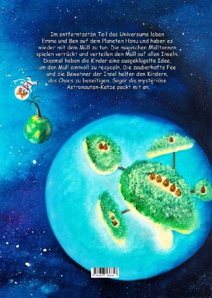 Inhalt:Im entferntesten Teil des Universums leben Emma und Ben auf dem Planeten Honu und haben es wieder mit dem Müll zu tun. Die magischen Mülltonnen spielen verrückt und verteilen den Müll auf allen Inseln. Diesmal haben die Kinder eine ausgeklügelte Idee, um den Müll sinnvoll zu recyceln. Die zauberhafte Fee und die Bewohner der Insel helfen den Kindern, das Chaos zu beseitigen. Sogar die mysteriöse Astronauten-Katze packt mit an.Rund um das Buch:Die Welt in meinem Bilderbuch ist eine Ableitung von unserem Planeten Erde und befasst sich mit dem Thema Umweltverschmutzung. Das Aussehen der Natur und der Tiere orientiert sich an tropische Inseln (z.B.: Hawaii). Sogar die Namen in der Geschichte kommen aus der hawaiianischen Sprache (z.B.: "Honu" bedeutet Schildkröte). Die Kinder stellen somit Verbindungen zwischen unserer und der Phantasiewelt im Bilderbuch her und können auf eine naive und liebevolle Art mit dem Thema Verschmutzung der Umwelt und Recycling in Berührung kommen.