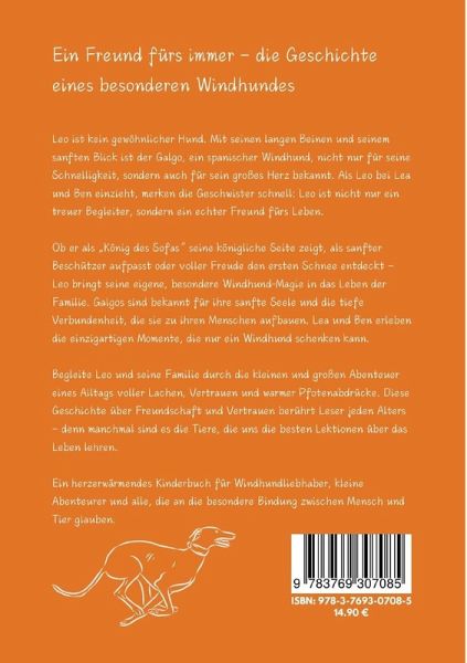 Ein Freund fürs immer - die Geschichte eines besonderen Windhundes Leo ist kein gewöhnlicher Hund. Mit seinen langen Beinen und seinem sanften Blick ist der Galgo, ein spanischer Windhund, nicht nur für seine Schnelligkeit, sondern auch für sein großes Herz bekannt. Als Leo bei Lea und Ben einzieht, merken die Geschwister schnell: Leo ist nicht nur ein treuer Begleiter, sondern ein echter Freund fürs Leben. Ob er als "König des Sofas" seine königliche Seite zeigt, als sanfter Beschützer aufpasst oder voller Freude den ersten Schnee entdeckt - Leo bringt seine eigene, besondere Windhund-Magie in das Leben der Familie. Galgos sind bekannt für ihre sanfte Seele und die tiefe Verbundenheit, die sie zu ihren Menschen aufbauen. Lea und Ben erleben die einzigartigen Momente, die nur ein Windhund schenken kann. Begleite Leo und seine Familie durch die kleinen und großen Abenteuer eines Alltags voller Lachen, Vertrauen und warmer Pfotenabdrücke. Diese Geschichte über Freundschaft und Vertrauen berührt Leser jeden Alters - denn manchmal sind es die Tiere, die uns die besten Lektionen über das Leben lehren. Ein herzerwärmendes Kinderbuch für Windhundliebhaber, kleine Abenteurer und alle, die an die besondere Bindung zwischen Mensch und Tier glauben.