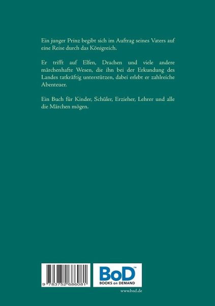 Ein junger Prinz begibt sich im Auftrag seines Vaters auf eine Reise durch das Königreich.Er trifft auf Elfen, Drachen und viele andere märchenhafte Wesen, die ihn bei der Erkundung des Landes tatkräftig unterstützen, dabei erlebt er zahlreiche Abenteuer.Ein Buch für Kinder, Schüler, Erzieher, Lehrer und alle die Märchen mögen.