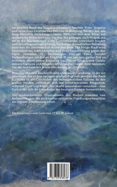 Ritter Hugolin lebt einfach, aber glücklich auf der Stammburg eines alten Rittergeschlechts, als er durch einen benachbarten Adligen verjagt wird. Der gierige Graf Reginald täuscht vor, der Kaiser rufe Hugolin zum Kreuzzug. Gegen seinen Willen lässt sich der Ritter zu einem Schwur zwingen. In der Erwartung, den jungen Ritter in den Tod zu schicken, übernimmt Graf Reginald die Kontrolle auf Burg Bärenfels. Hugolin jedoch sucht einen Weg nach Italien, wo der Kaiser das Kreuzfahrerheer sammeln soll. Gefährliche, manchmal auch lustige Missgeschicke und Herausforderungen begegnen Hugolin entlang der alten Römerstraße nach Ulm und weiter die Donau hinab. Er begegnet der schönen und selbstbewussten Carolina von Bratislava. Nach langen Umwegen gelingt es dem Ritter endlich, die geliebte Carolina zu heiraten. Sie reisen weiter über Konstantinopel nach Kreta und Sizilien. Am kaiserlichen Hof zu Palermo setzt die Handlung des zweiten Bandes ein. Admiral Heinrich von Malta verpflichtet Hugolin, bei der Niederschlagung eines arabischen Aufstandes mitzuwirken. Hugolin wird verletzt. Carolina und Hugolin begeben sich auf ein Schiff, das sie nach Neapel bringen soll. Sie begegnen einem römischen Ehepaar, Aurelia Colonna und Leonardo Crescentio. Diese beiden hatten im Auftrag einer römischen Adelsgruppe versucht, den Kaiser von der Idee zu überzeugen, eine Römerin zu heiraten und in Rom eine Residenz zu errichten. Es entwickelt sich eine tiefe Freundschaft. In Neapel werden die Freunde in eine Verschwörung verwickelt, welche sich um eine geheimbündlerische Bruderschaft entspinnt. Carolina gerät in die Fänge von Entführern. Unter großer Aufregung lösen sich die Verwirrungen endlich auf. Hugolin und die Seinen können die Reise nach Rom fortsetzen, wo neue Abenteuer warten.