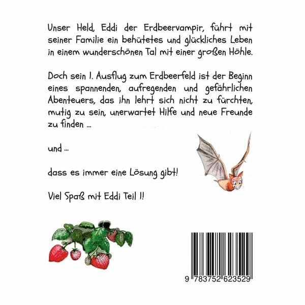 Unser Held, Eddi der Erdbeervampir, führt mit seiner Familie ein behütetes und glückliches Leben in einem wunderschönen Tal mit einer großen Höhle.Doch sein 1. Ausflug zum Erdbeerfeld ist der Beginn eines spannenden, aufregenden und gefährlichen Abenteuers, das ihn lehrt sich nicht zu fürchten, mutig zu sein, unerwartet Hilfe und neue Freunde zu finden...und...dass es immer eine Lösung gibt!Viel Spaß mit Eddi Teil 1