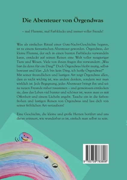 Was als einfaches Ritual einer Gute-Nacht-Geschichte begann, ist zu einem fantastischen Abenteuer geworden. Örgendwas, der kleine Flummi, der sich in einen bunten Farbklecks verwandeln kann, entdeckt auf seinen Reisen eine Welt voller neugieriger Tiere und Wesen. Viele von ihnen fragen ihn verwundert: "Was bist du denn für ein Ding?" Doch Örgendwas bleibt mutig, selbst bewusst und klar: "Ich bin kein Ding, ich heiße Örgendwas!" Mit seiner freundlichen und lustigen Art zeigt Örgendwas allen, dass es nicht wichtig ist, was andere denken, sondern wer man wirklich ist. Jede Begegnung, jedes Abenteuer bringt ihn und sei ne neuen Freunde näher zusammen-und gemeinsam entdecken sie, dass das Leben viel bunter und schöner ist, wenn man es mit Offenheit und einem Lächeln angeht. Tauche ein in die farbenfrohen und lustigen Reisen von Örgendwas und lass dich von seiner fröhlichen Art verzaubern