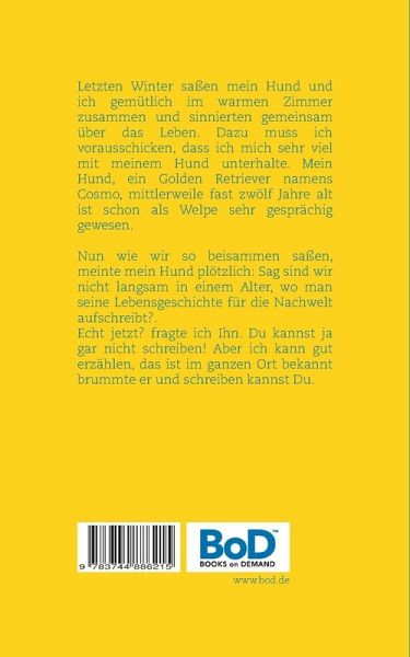 Letzten Winter saßen mein Hund und ich gemütlich im warmen Zimmer zusammen und sinnierten gemeinsam über das Leben. Dazu muss ich vorausschicken, dass ich mich sehr viel mit meinem Hund unterhalte. Mein Hund, ein Golden Retriever namens Cosmo, mittlerweile fast zwölf Jahre alt ist schon als Welpe sehr gesprächig gewesen.Nun wie wir so beisammen saßen, meinte mein Hund plötzlich: Sag, sind wir nicht langsam in einem Alter, wo man seine Lebensgeschichte für die Nachwelt aufschreibt?Echt jetzt? fragte ich Ihn. Du kannst ja gar nicht schreiben! Aber ich kann gut erzählen, das ist im ganzen Ort bekannt, brummte er, und schreiben kannst Du.