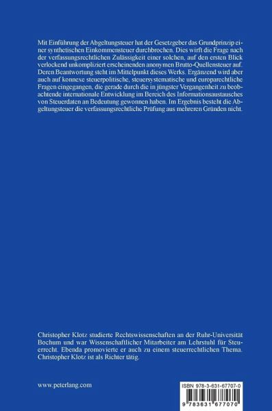 Mit Einführung der Abgeltungsteuer ist ein neues Zeitalter in der Besteuerung von Kapitaleinkünften angebrochen. Hiermit einher gehen neben einer Vielzahl einfach-rechtlicher Fragen vor allem Fragen nach der verfassungsrechtlichen Zulässigkeit einer solchen, auf den ersten Blick verlockend unkompliziert erscheinenden anonymen Brutto-Quellensteuer. Deren Beantwortung steht im Mittelpunkt dieses Werks. Ergänzend wird aber auch auf konnexe steuerpolitische, steuersystematische und europarechtliche Fragen eingegangen, die gerade durch die in jüngster Vergangenheit zu beobachtende internationale Entwicklung im Bereich des Informationsaustausches von Steuerdaten an Bedeutung gewonnen haben. Im Ergebnis besteht die Abgeltungsteuer die verfassungsrechtliche Prüfung eindeutig nicht.