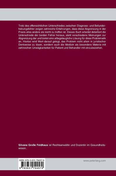 Trotz des offensichtlichen Unterschiedes zwischen Diagnose- und Befunder-hebungsfehler zeigen zahlreiche Erfahrungen, dass diese Abgrenzung in der Praxis alles andere als leicht zu treffen ist. Dieses Buch arbeitet detailliert die Unterschiede der beiden Fehler heraus, stellt verschiedene Meinungen zur Abgrenzung dar und bietet eine alltagstaugliche Lösung für diese Problematik an. Hierbei wird Wert darauf gelegt, das Problem nicht allein in juristischer Denkweise zu lösen, sondern auch die Medizin als besondere Materie mit zahlreichen Unwägbarkeiten für Patient und Behandler mit einzubeziehen.