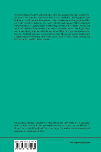 Vereinbarungen zweier Markeninhaber über die Abgrenzung der Schutzbereiche ihrer Markenrechte sind in der Praxis weit verbreitet. Sie begegnen dem Praktiker vor allem im Rahmen eines bei der Markenanmeldung durchgeführten Widerspruchsverfahrens. Die Autorin klärt Rechtsnatur, Zulässigkeit und Wirksamkeit der Abgrenzungsvereinbarung und stellt diese insbesondere auf den Prüfstand des Kartellrechts sowie des Lauterkeitsrechts. Die Ergebnisse der Untersuchung münden in Gestaltungsvorschläge für Abgrenzungsvereinbarungen. Das Buch zeichnet ein Gesamtbild zum Thema der markenrechtlichen Abgrenzungsvereinbarung und leistet auch für die Praxis einen Beitrag zur Rechtsklarheit und Rechtssicherheit.