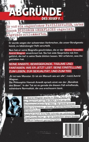 Er war ein angesehener Familienvater, unter dessen biederer Oberfläche ungeahnte Abgründe schlummerten. Er wurde wegen der schwersten Verbrechen, die unser Strafgesetz kennt, zu lebenslanger Haft verurteilt. Nun hat er seine Biografie geschrieben, die er der Wiener Anwältin Astrid Wagner anvertraut hat. Sie hat viele Gespräche mit ihm geführt, die tief in seine Seele blicken lassen. Wir erfahren, was ihn getrieben hat. Seine Ängste, Beweggründe, Träume und Fantasien. Wie er jetzt lebt. Seine Einstellung zum Leben, zur Sexualität, und zum Tod. "Er ist kein Monster. Er ist ein Mensch wie wir alle", meint Astrid Wagner. Die Philosophin Hannah Arendt sprach einst von der "Banalität des Bösen". In der Tat ist es gerade die diesem Fall anhaftende, scheinbare Normalität, die uns erschauern lässt.