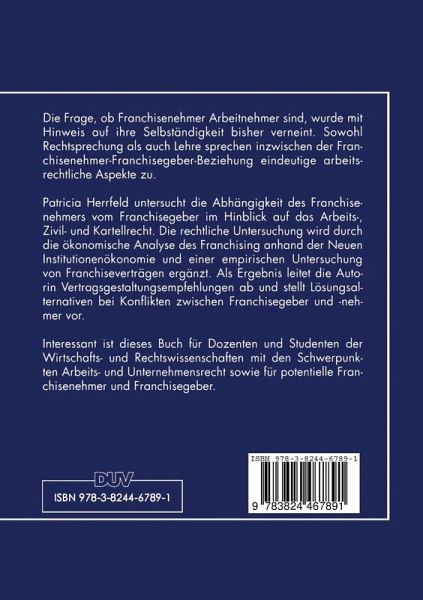 Die Frage, ob Franchisenehmer Arbeitnehmer sind, wurde mit Hinweis auf ihre Selbständigkeit bisher verneint. Sowohl Rechtsprechung als auch Lehre sprechen inzwischen der Franchisenehmer-Franchisegeber-Beziehung eindeutige arbeitsrechtliche Aspekte zu. Patricia Herrfeld untersucht die Abhängigkeit des Franchisenehmers vom Franchisegeber im Hinblick auf das Arbeits-, Zivil- und Kartellrecht. Die rechtliche Untersuchung wird durch die ökonomische Analyse des Franchising anhand der Neuen Institutionenökonomie und einer empirischen Untersuchung von Franchiseverträgen ergänzt. Als Ergebnis leitet die Autorin Vertragsgestaltungsempfehlungen ab und stellt Lösungsalternativen bei Konflikten zwischen Franchisegeber und -nehmer vor.