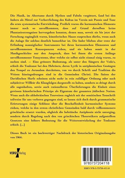 Die Musik, im Altertume durch Mythen und Fabeln vergöttert, fand bei den Indern als Mittel zur Verherrlichung des Kultus im Verein mit Poesie und Tanz die erste systematische Entwickelung. Freilich waren die harmonischen Elemente immer noch so unvollkommen, dass auf Grund derselben keine Phantasieerzeugnisse hervorgehen konnten, denen man, soweit sie bis jetzt der Forschung zugänglich waren, künstlerisches Maass zusprechen dürfte, wenn auch die Anlage für solches deutlich bemerkbar ist. Die Inder blieben aber trotz der Erfindung mannigfacher Instrumente bei ihren harmonischen Elementen und unvollkommenen Konsequenzen stehen, und sie haben somit in der Musikgeschichte nur den Anspruch, dass bei ihnen die ersten Anfänge unvollkommener Tonsysteme, über welche sie selbst nicht einmal einig waren, zu suchen sind. Eine grössere Bedeutung, als unter den Sängern der Veda's, erhielt die Tonkunst bei den Hebräern, deren Lyrik in antiphonischen Gesängen den Tempel zu Jerusalem durchtönte, von wo durch Schrift und Tradition die Weisen hineingedrungen sind in die Gemeinden Christi. Die Saiten der Davidischen Harfe scheinen nicht mehr in rein zufälliger Ordnung oder nach subjektiver Willkür die Klangfolgen dargestellt zu haben, sondern es dringt durch alle sagenhaften, sowie auch rationelleren Überlieferungen die Einheit eines gewissen künstlerischen Prinzips als Eigentum der gesamten jüdischen Nation. Wenn auch die althebräischen Tonweisen zugleich mit der semitischen Tonschrift teilweise für uns verloren gegangen sind, so lassen sich doch durch grammatische Erörterungen einige Schlüsse über die Beschaffenheit harmonischer Systeme ziehen, welche in den ersten christlichen Gemeinden bald durch vollkommenere griechische ersetzt wurden, obgleich die hebräische Antiphonie nicht unterging, sondern durch Regelung nach den von griechischen Theoretikern aufgestellten Gesetzen eine höhere Bedeutung für die Weiterentwickelung der Tonkunst erhielt. [...]