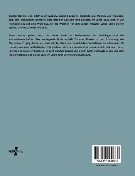 Seine Werke gelten auch bis heute noch als Meilensteine der Soziologie und der Kulturwissenschaften. Das vorliegende Buch enthält Darwins Thesen zu der Entstehung des Menschen: Er ging davon aus, dass alle Facetten des menschlichen Verhaltens, vor allem aber die moralischen und intellektuellen Fähigkeiten, nicht angeboren sind, sondern sich erst über einen längeren Zeitraum entwickeln. Er geht darüber hinaus von einem Mehrstufensytem aus und dass jede Zivilisation jede dieser Stufe im Laufe ihrer Entwicklung durchläuft.