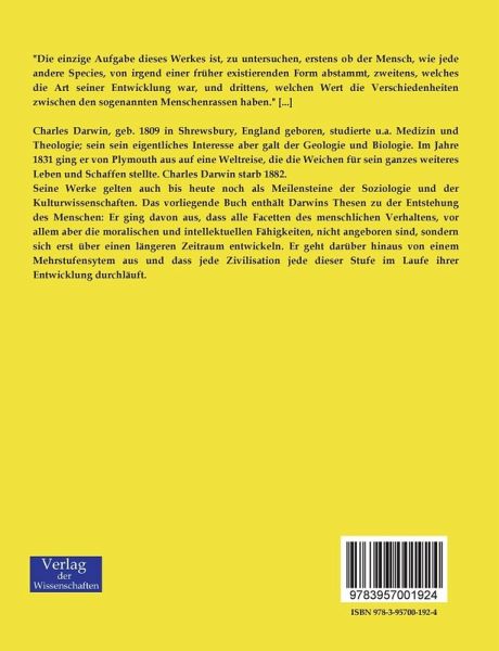 Seine Werke gelten auch bis heute noch als Meilensteine der Soziologie und der Kulturwissenschaften. Das vorliegende Buch enthält Darwins Thesen zu der Entstehung des Menschen: Er ging davon aus, dass alle Facetten des menschlichen Verhaltens, vor allem aber die moralischen und intellektuellen Fähigkeiten, nicht angeboren sind, sondern sich erst über einen längeren Zeitraum entwickeln. Er geht darüber hinaus von einem Mehrstufensytem aus und dass jede Zivilisation jede dieser Stufe im Laufe ihrer Entwicklung durchläuft.