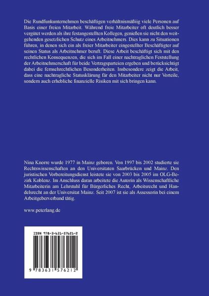 Die Rundfunkunternehmen beschäftigen verhältnismäßig viele Personen auf Basis einer freien Mitarbeit. Während freie Mitarbeiter oft deutlich besser vergütet werden als ihre festangestellten Kollegen, genießen sie nicht den weitgehenden gesetzlichen Schutz eines Arbeitnehmers. Dies kann zu Situationen führen, in denen sich ein als freier Mitarbeiter eingestellter Beschäftigter auf seinen Status als Arbeitnehmer beruft. Diese Arbeit beschäftigt sich mit den rechtlichen Konsequenzen, die sich im Fall einer nachträglichen Feststellung der Arbeitnehmerschaft für beide Vertragsparteien ergeben und berücksichtigt dabei die fernsehrechtlichen Besonderheiten. Insbesondere zeigt die Arbeit, dass eine nachträgliche Statusklärung für den Mitarbeiter nicht nur Vorteile, sondern auch erhebliche finanzielle Risiken mit sich bringen kann.