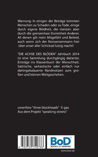 SATIRONIE, KAFKALAUER, SACKKREISEL"Die Achse des Blöden" Jahrbuch 2014 ist eine Sammlung durchgängig datierter, satirischer Texte und sarkastischer Spiegelbilder zum Weltgeschehen. Die meisten Texte beschäftigen sich mit einer aktuellen Meldung des Tages, manchmal auch mit mehreren korrespondierenden Ereignissen, aber immer mit der ungebrochenen, omnipräsenten Macht des Blöden.Warnung: In einigen der Beträge kommen Menschen zu Schaden oder zu Tode, einige durch eigene Blödheit, die meisten aber durch die grenzenlose Dummheit Anderer. All denen gilt sein Mitgefühl und Beileid, auch wenn sich der Nonsensenmann hier weiterhin über unser aller Schicksal lustig macht!